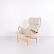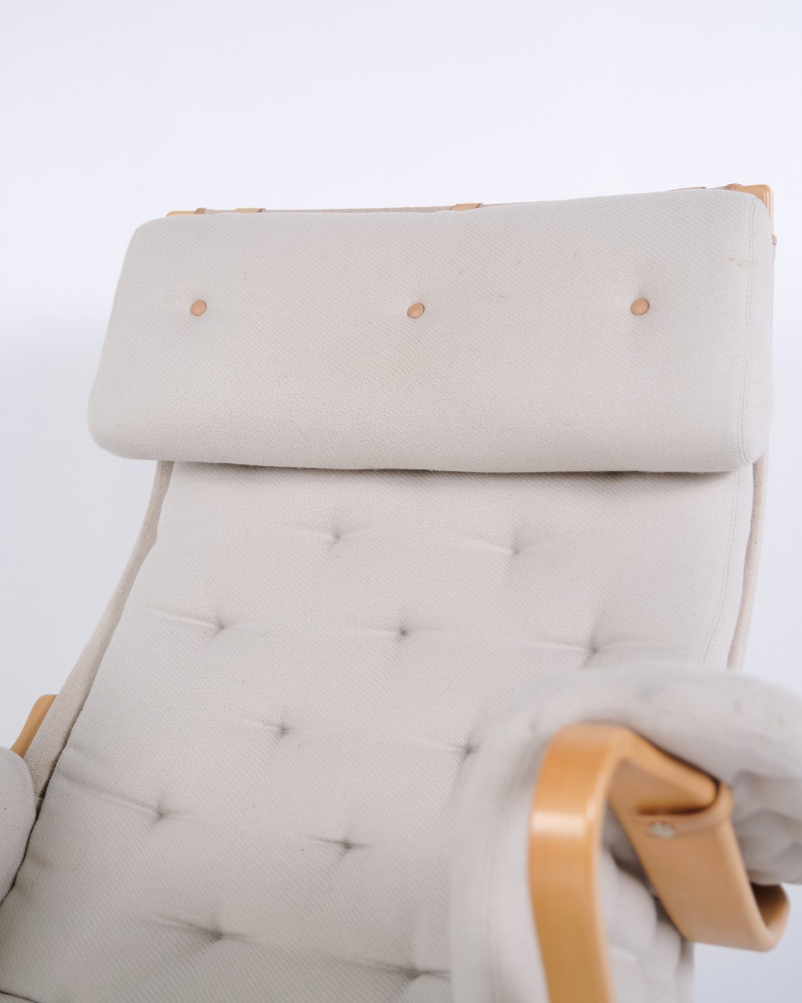 Pernilla lænestol med tilhørende skammel, model 69, designet af Bruno Mathsson og fremstillet af DUX som 35 års jubilæumsudgave. Stolen er udført i bøgetræ med polstring i lyst stof og har et karakteristisk, ergonomisk formsprog, der følger kroppens naturlige kurver og sikrer høj komfort.