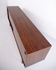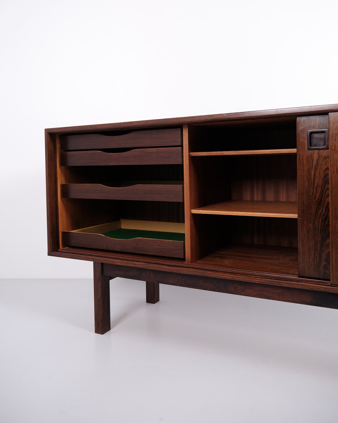 Skænken har to skydelåger med indfræsede greb i massivt palisander. Indvendigt findes fire udtræksskuffer samt hylder, som giver gode opbevaringsmuligheder og gør møblet velegnet til både stue og spisestue.
