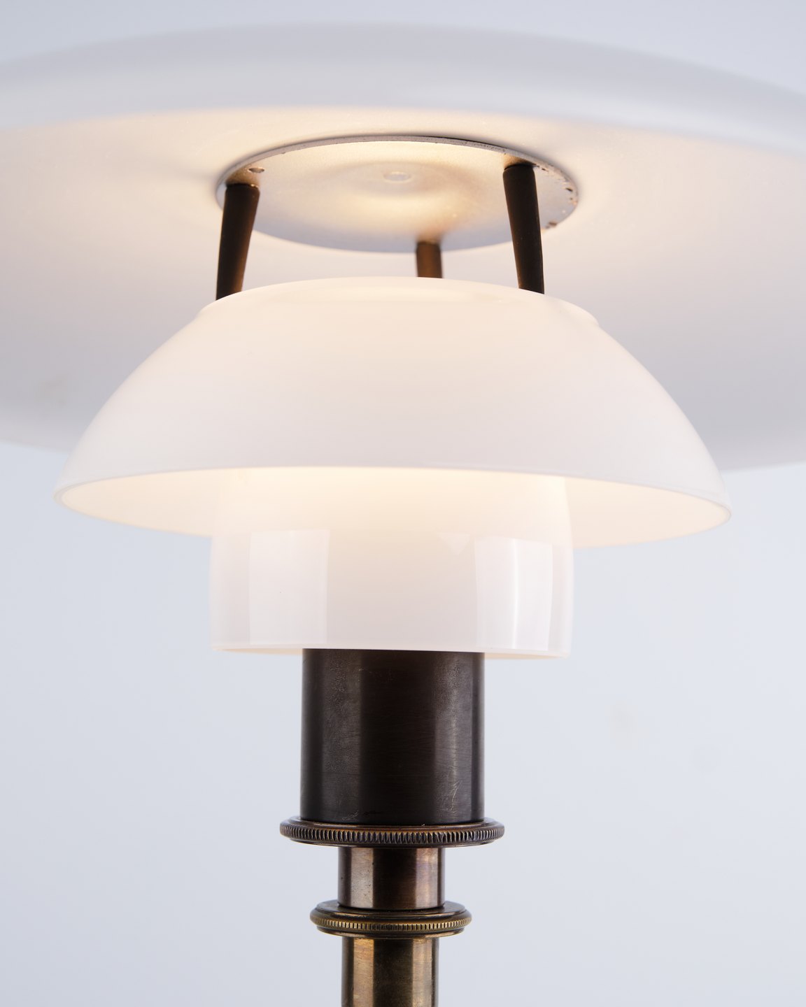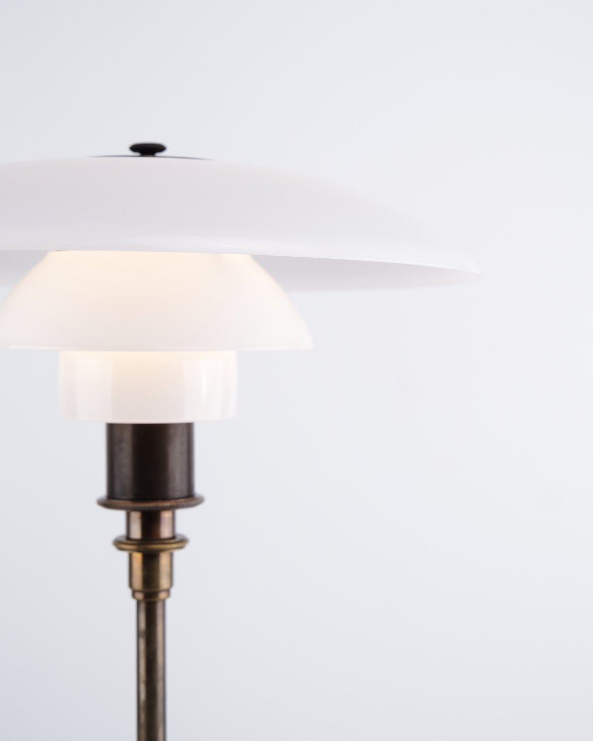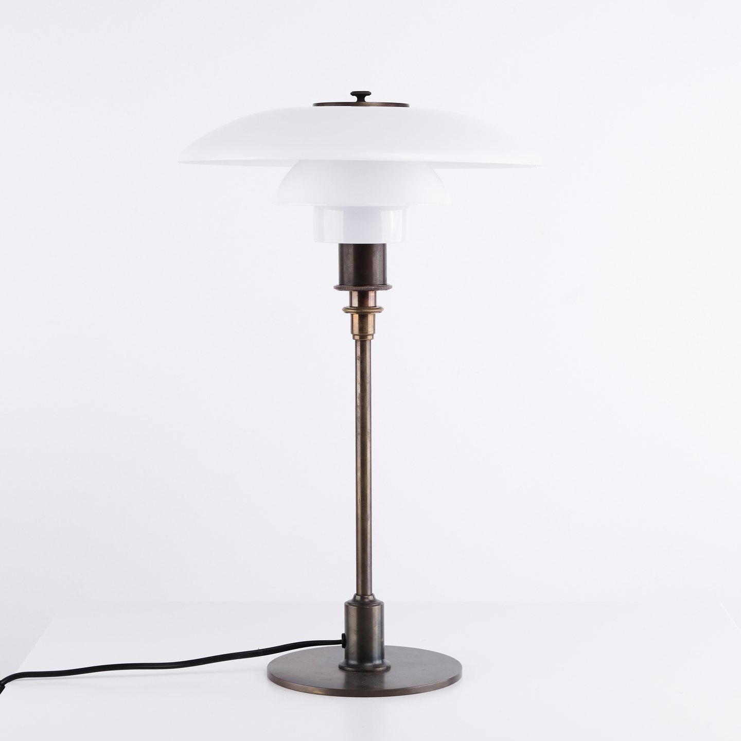 PH 3/2 Treph bordlampe designet af Poul Henningsen og udgivet som jubilæumsmodel i 1994 af Louis Poulsen. Lampen er udført med bruneret stel og klassiske skærme i hvidt opalglas, som sikrer et blødt og blændfrit lys. Det ikoniske treskærmssystem er udviklet for optimal lysfordeling og er et centralt element i Henningsens designfilosofi.