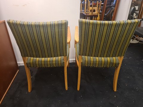 Par Dansk Design armstole fra 1950'erne. Fremstillet i eg og betrukket med stof fra 1970'erne. Fremstår gode og stabile uden nævneværdige brugsspor.