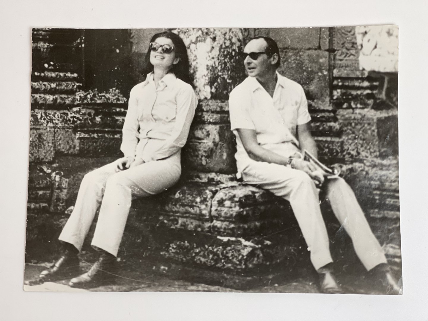 Fotografieret viser Jackie Kennedy og britten Lord Harlech siddende sammen foran et tempel i Cambodia.