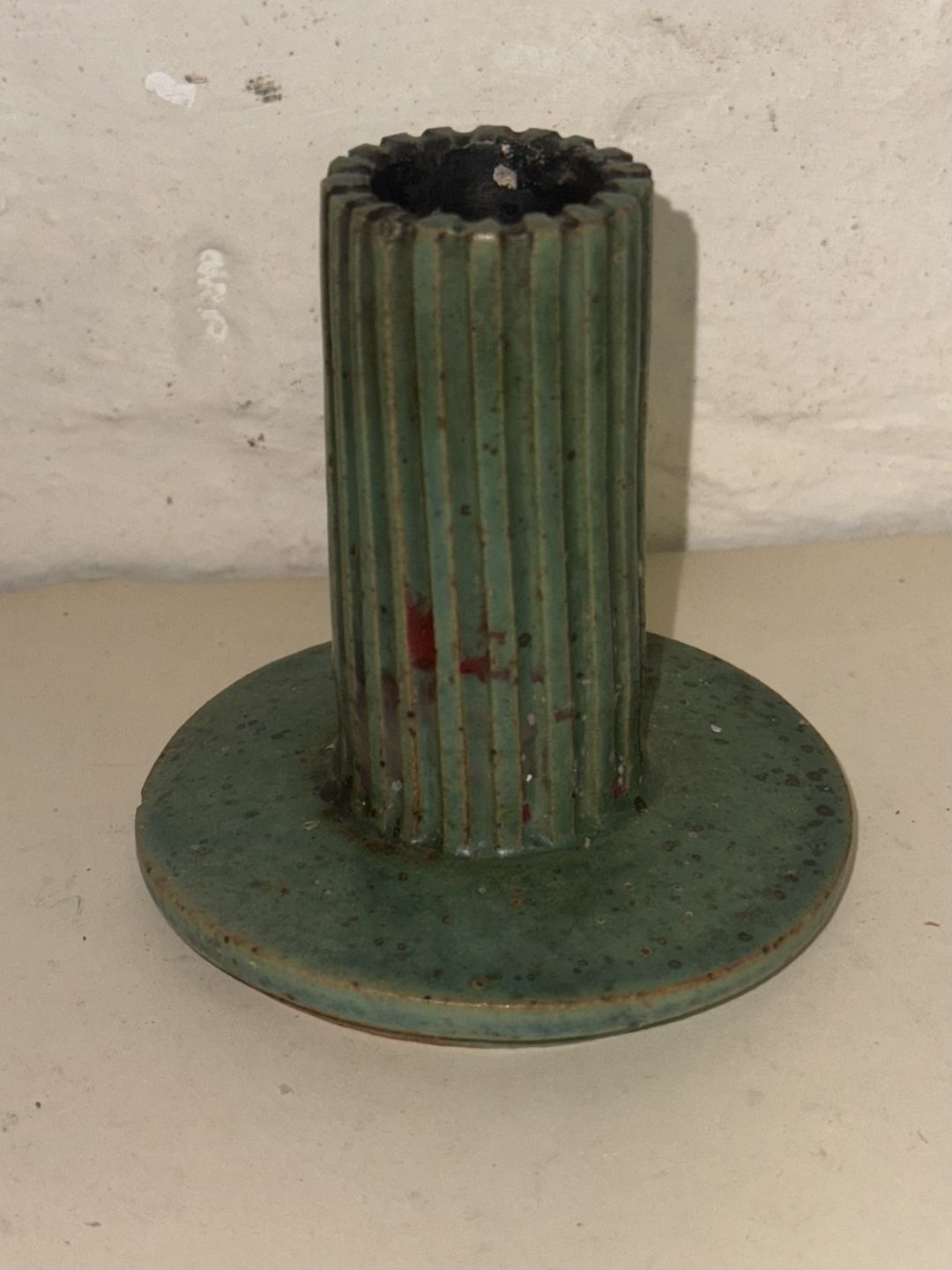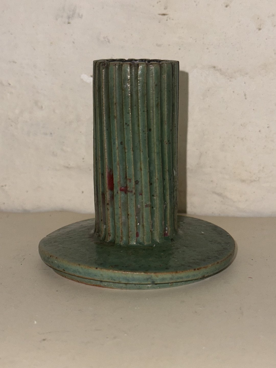 Lysestage i keramik med rillet lyspibe. I god stand. Dækket af grøn glasur. Brugsspor indvendigt. Indridset AB på undersiden sammen med modelnummer 133. H. 9,2 cm