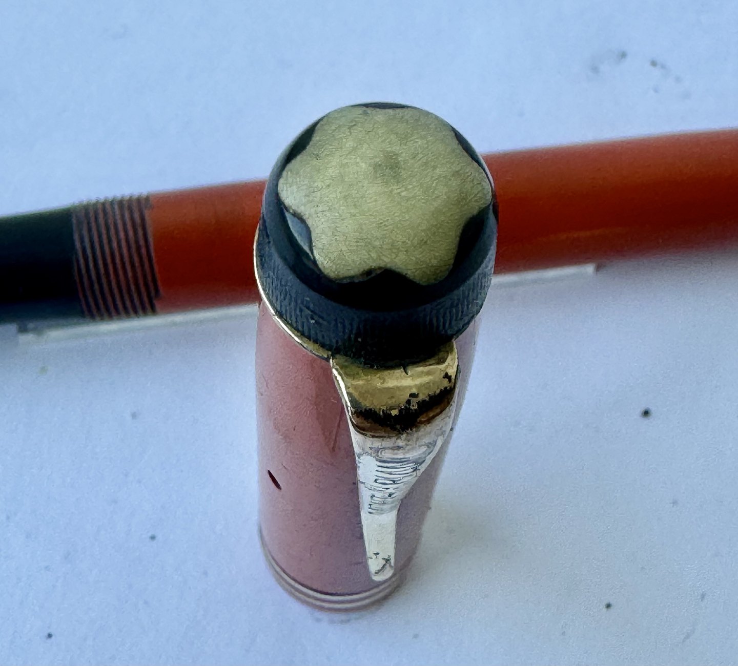 Koralrød Montblanc Simplo nr. 20 fyldepen. Push button filler. Produceret i 1930’erne i Danmark. Let udvisket fabrikslogo på “kroppen”. Enden på clip’en er knækket. Ellers ingen skader eller reparationer. Alle dele er originale Montblanc fra perioden inclusiv den flotte 14 karat guld spids. Fyldepennen fungerer ikke. Ved ekstra betaling på d.kr. 250,00 indsættes ny gummisæk, så den igen bliver funktionsduelig. Mål: L. 13 cm