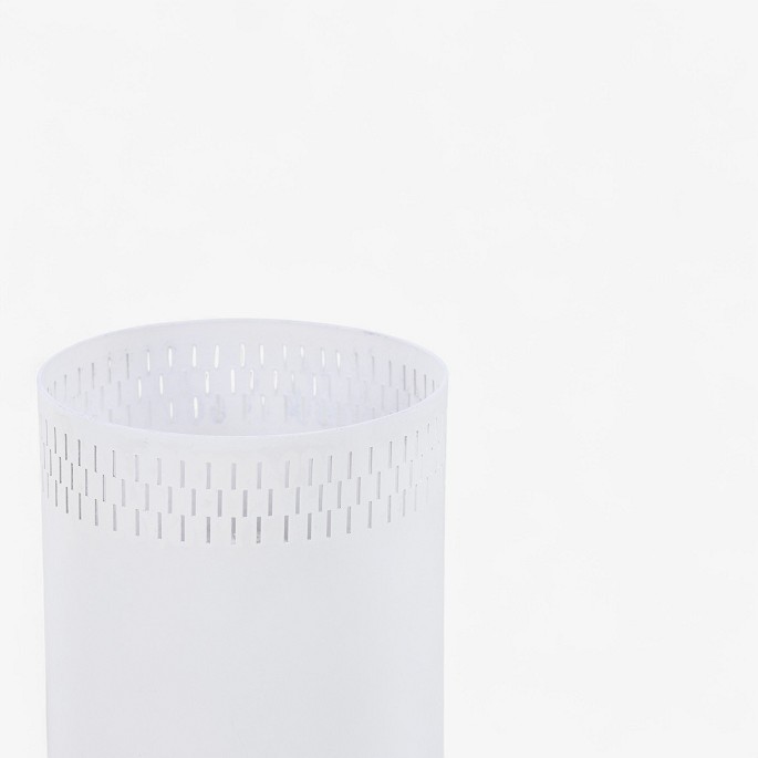 Cylindrisk formet bordlampe med base i patineret teak og skærm i hvidlakeret metal.