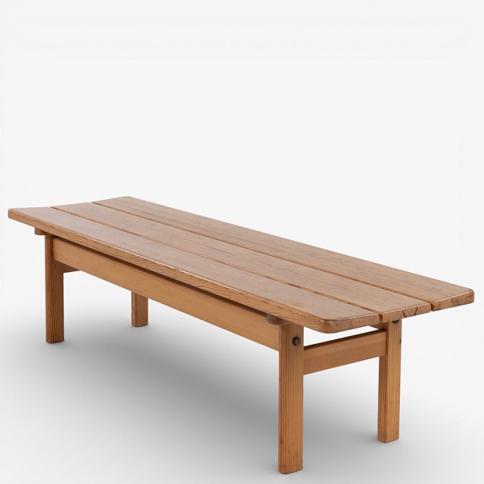 Bænk i massiv, lakeret fyrretræ. Mærket fra producent.