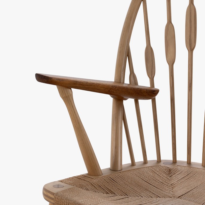 JH 550 - 'Peacock Chair' armchair in patinated ash with teak armrests and woven paper yarn seat. Branded by manufacturer.