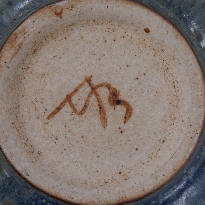 Lille fad i stentøj m. blågrøn glasur. Signeret.