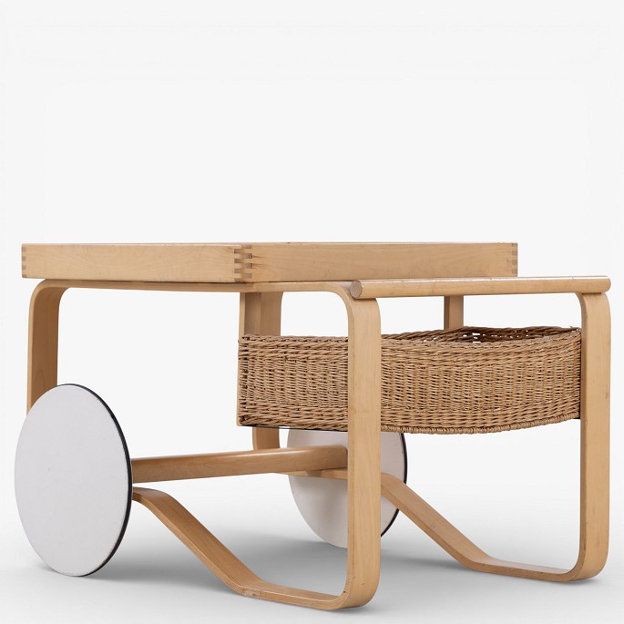 'Tea Trolley 900' - Serving trolley in patinated birch with white tiles.