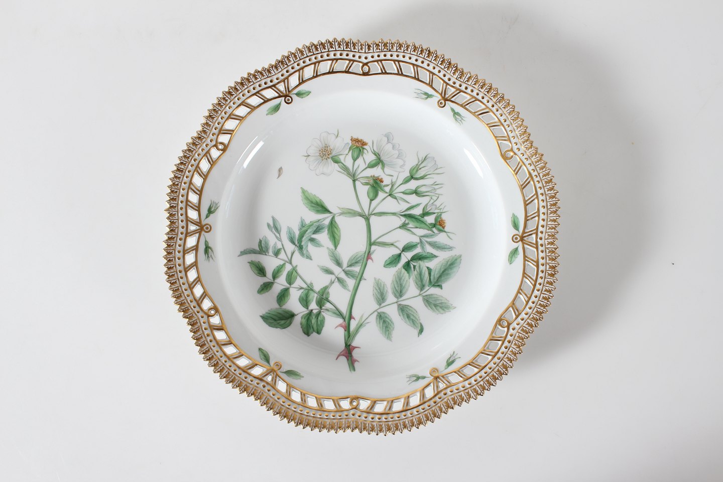 Royal Copenhagen Flora Danica Round plate with full lace no. 20/3574 Decorated with flower "Rosa canina L. var albiflora" and stamp from 1957 Diameter 28.5 cm 1. quality, very fine condition