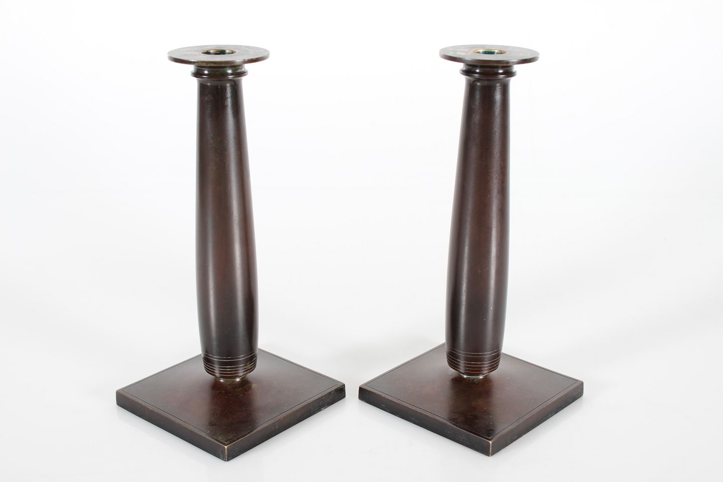 Just Andersen - Denmark Pair candlesticks made of bronze Model no. 155 Sign: Just A - Denmark + model B 155 Height 25 cm Length x width base: 11.5 x 11.5 cm Good vintage condition with beautiful brown patina
