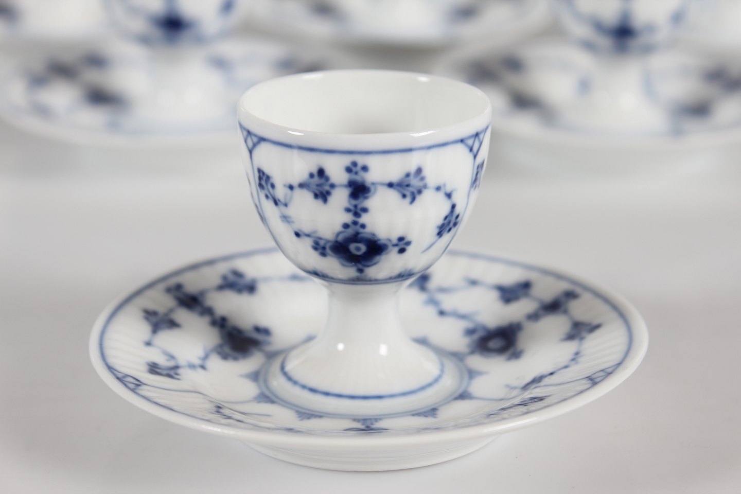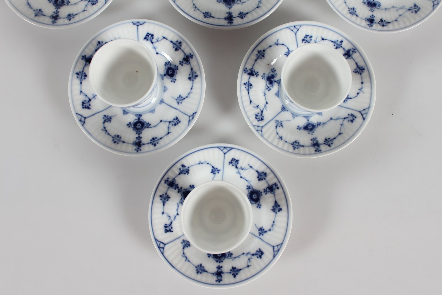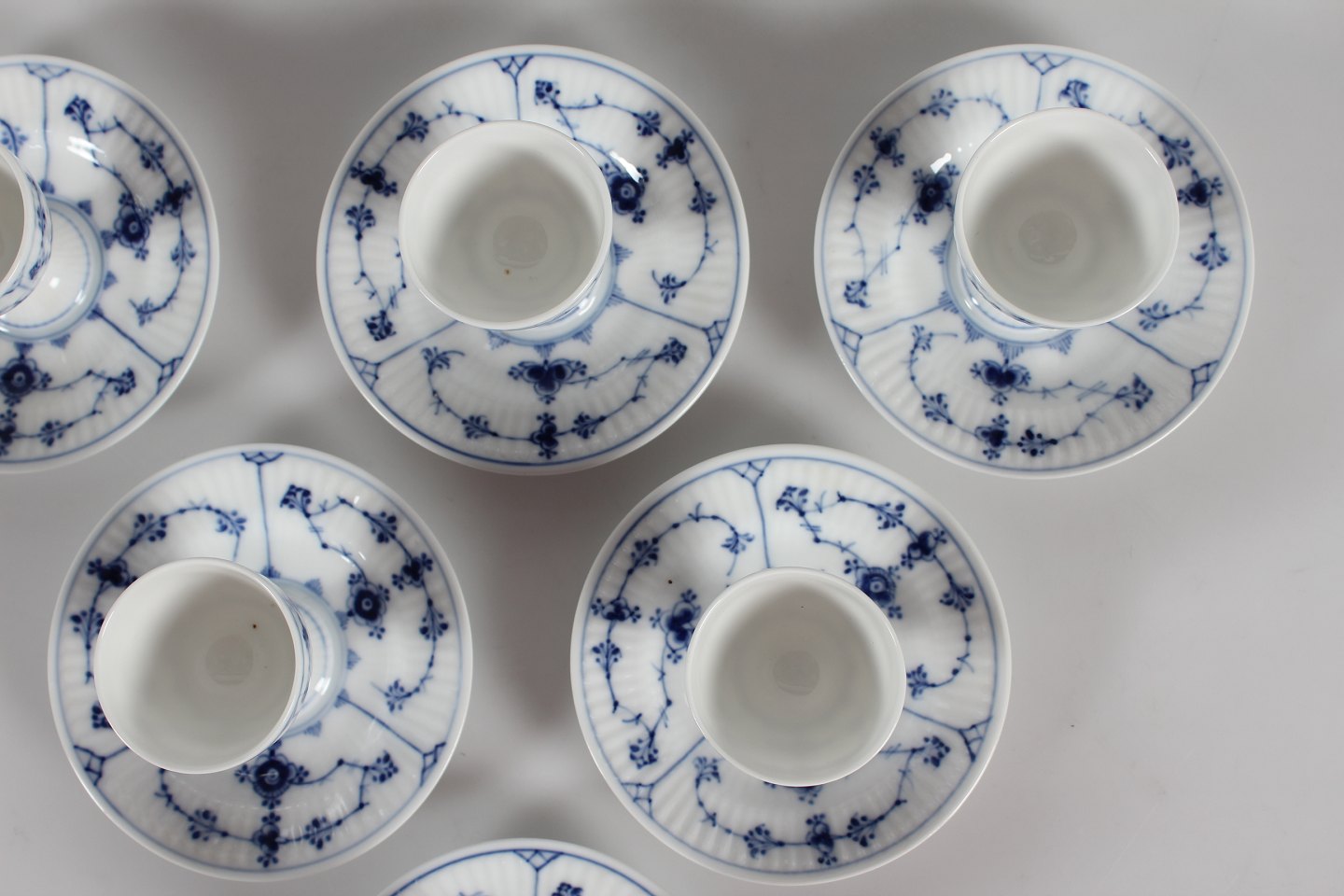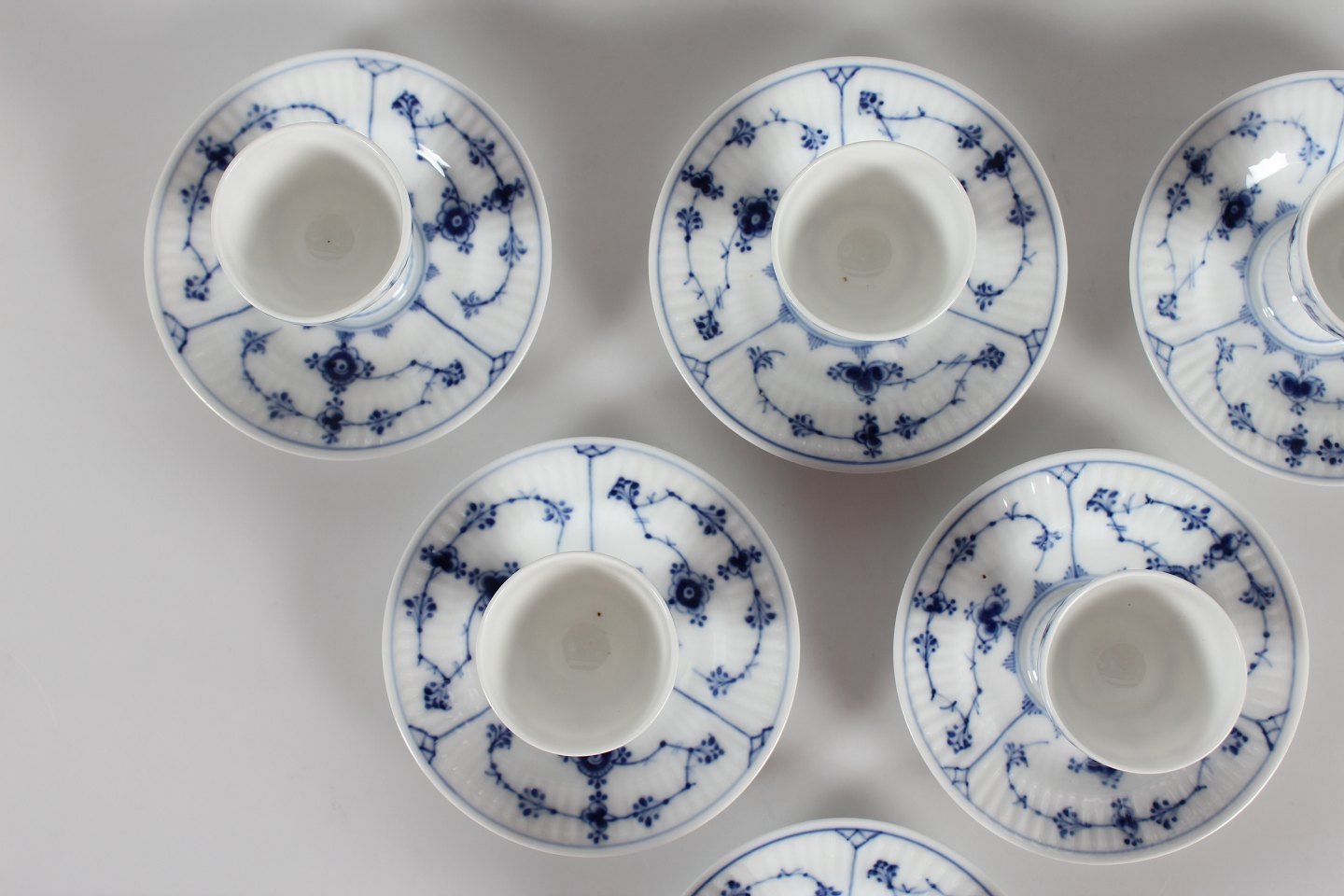 Royal Copenhagen Musselmalet Riflet Sæt på 6 sjældne æggebægere m/fasttilknyttet undertallerken nr. 1/117 Med stempel fra perioden 1893-1900 Diameter 10,5 cm Højde 6 cm 1. sortering Fin fejlfri stand uden skår eller revner