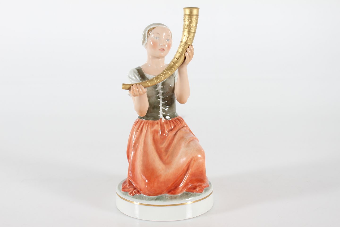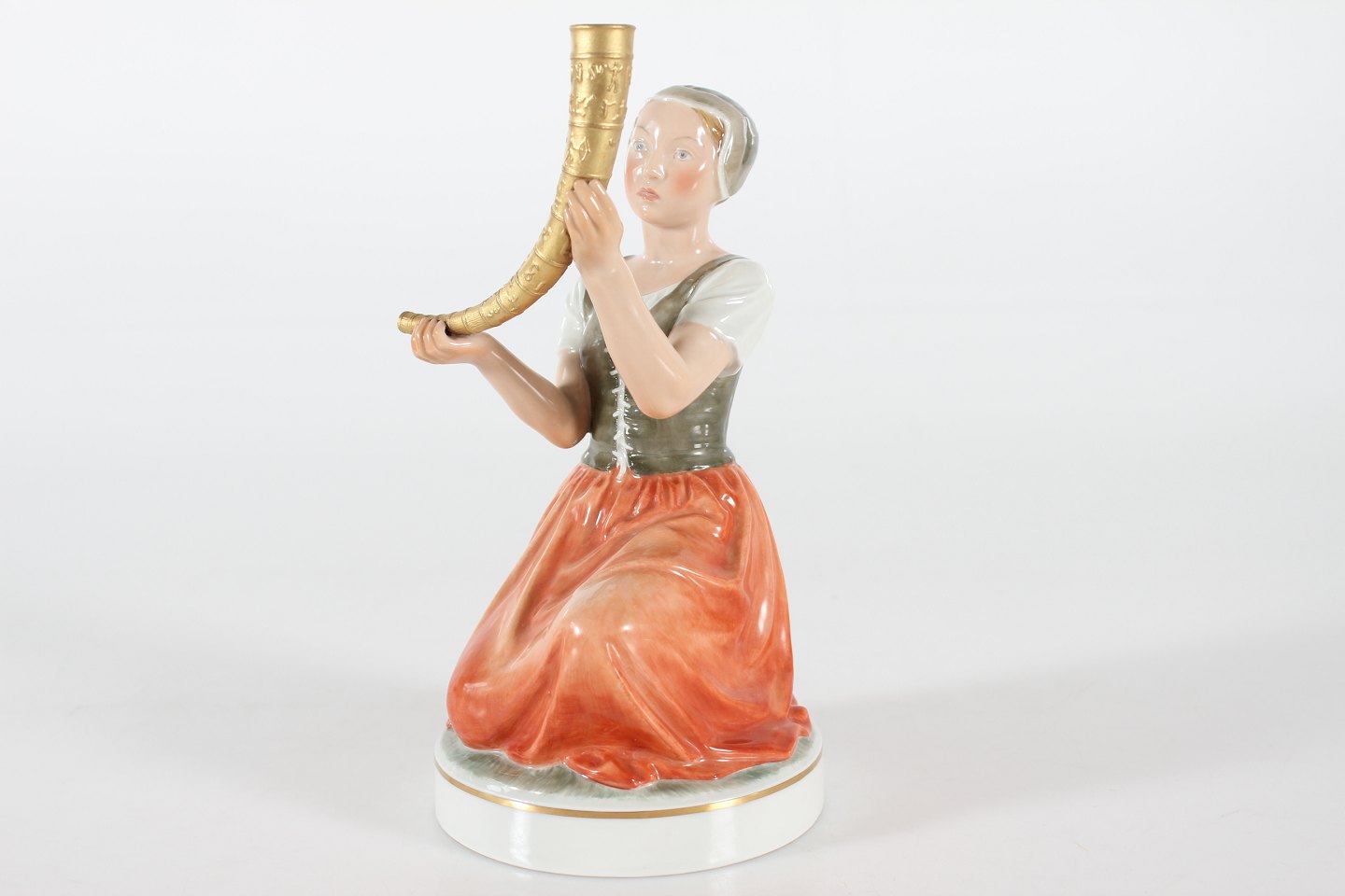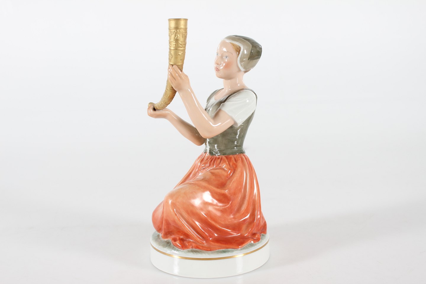 Royal Copenhagen Figurer Pigen med guldhornene model nr. 12242 efter model af Holger Christensen Højde 21,5 cm Diameter sokkel 11 cm Fin fejlfri 1. sorterting