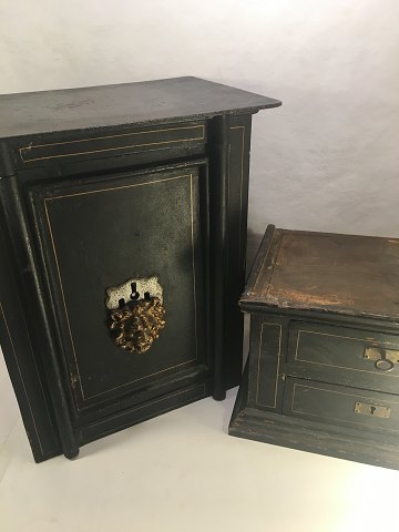 Old unique safe in miniature. standing on wooden shelf. with 2 drawers.