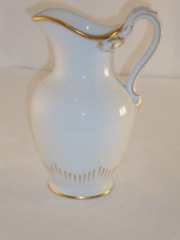 Hartmann, Bing & Grøndahl, hvidt porcelæn med guldkant, samt guldstreg. Chokolade kande med hank der deler sig 2. Højde 23,5 cm. Produceret i perioden 1915-48. I. sortering men den har 2 små brændingsprikker i glasuren. SOLGT.