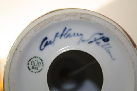 Bordlampe fra Bing & Grøndahl designet af Carl Harry Stålhane. Hvid porcelæn med brun abstrakt glasur. 1. sortering. Højde uden fatning 21 cm., diameter 13 cm. SOLGT