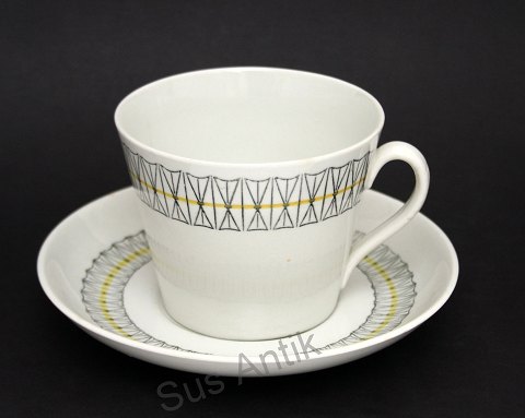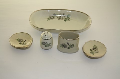 Vallø 1007 med platinkant, Kjøbenhavns Porcellainsmaleri. Motiv Grøn rose. Fra slutningen af 1930'erne. Aflang skål/fad. 12,5x22 cm. solgt Musling kuvertaskebæger. 7x10 cm. solgt Cigaretbæger. Højde 5,5 cm. solgt Peber. Højde 6 cm. solgt
