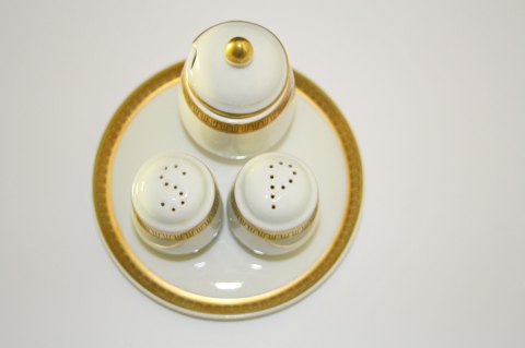 Lyngby, Danmark, Trend 450. Hvidt stel med græsk guldbort. Plat de menage bestående af salt og pebersæt, sennepskrukke med låg og rund bakke. Sælges samlet. Pris: SOLGT