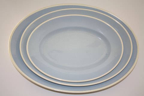 Aluminia fajance. Sonja lyseblå med hvid kant. Ovalt fad 38x27 cm. Pris: SOLGT Ovalt fad 37x26,5 cm. Pris: SOLGT Ovalt fad 32,5x 22 cm. Pris: SOLGT Ovalt fad 27,5x20 cm. Pris: SOLGT Ovalt fad til surt (ikke på foto) 23 x 15 cm. Pris: SOLGT