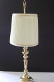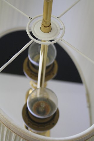 Bordlampe i messing med 2 arme og oval skærm i tynd plisseret stof. Lampen har stået på D'Angleterre hotel i København. Højde: 62 cm. Bredde med skærm 28 cm. Pris: SOLGT