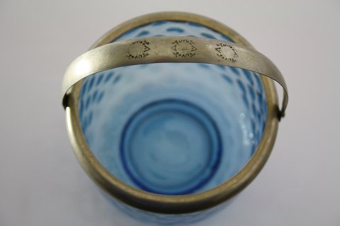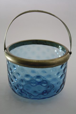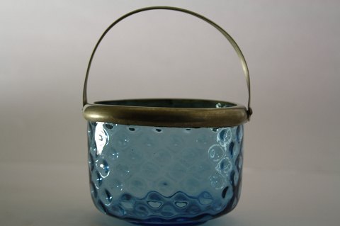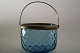 Søblå glasskål med hank, højde uden hank, 8 cm. diameter 10 cm.