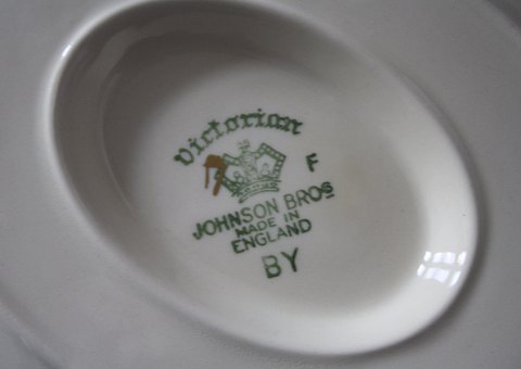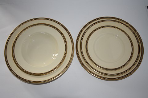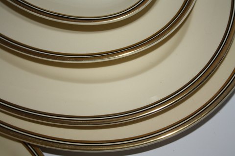 Johnson Bros. Victorian cremefarvet fajance spisestel med sorte og guld kantstriber. Rimelig stand.