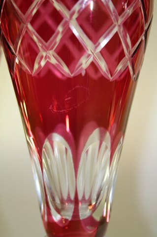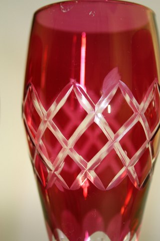 Bøhmisk Champagne krystalglas, højde 21 cm. På enkelte af glassene, er den røde farve lettere slidt, se ekstra fotos. Et glas har et lille afslag på foden, se ekstra foto. De 6 champagneglas sælges samlet for 600 kr. solgt