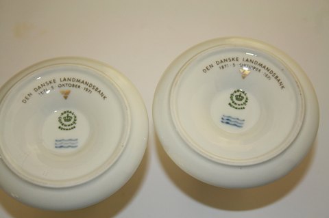 2 lysestager med guldbelægning. På den ene er guldbelægningen noget slidt. Der er inskription under lysestagerne. Den Danske Landmandsbank 1871 5. oktober 1971.