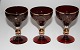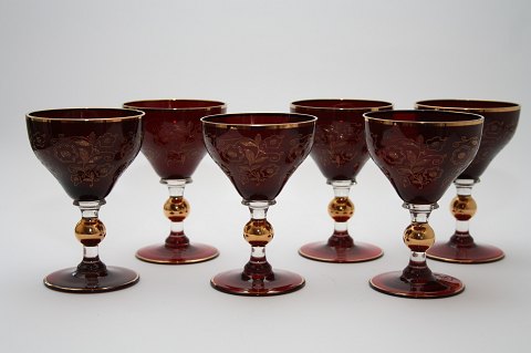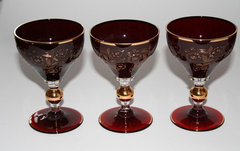 Bøhmiske likørglas vinrød med guldkant og guldciseleringer. Højde 11 cm. Diameter 6,5 cm. Glassene er meget smukke og i fin og hel stand. Pris: SOLGT