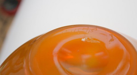 Orange skål fra det svenske glasværk Boda, designer Erik Höglund, højde 11,5 cm. diameter 14,5 cm. signeret H 1066/55. Pris: SOLGT