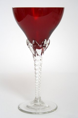 Meget smukke drinks glas med vinrød kumme og snoet stilk. Højde 15,8 cm. Diameter 7,7 cm. 2 af glassene har mikroskopisk kantafslag. 1 af glassene har et lidt større kantafslag. Sælges samlet. Pris: SOLGT