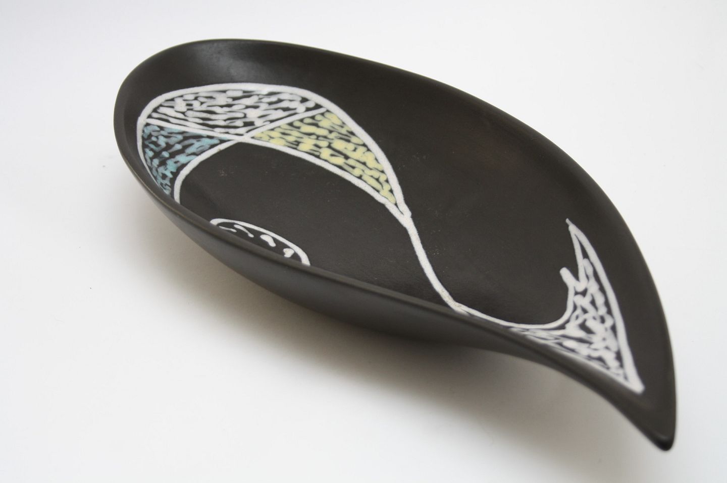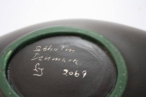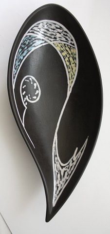 Søholm, Burgundia serie formgivet af Holm Sørensen, glasur og dekoration af Svend Aage Jensen. Serien produceres fra 1956 til slutningen af 1960'erne. Organisk skål. Længde 41 cm. Bredde 18 cm. Højde 9 cm. Pris: SOLGT