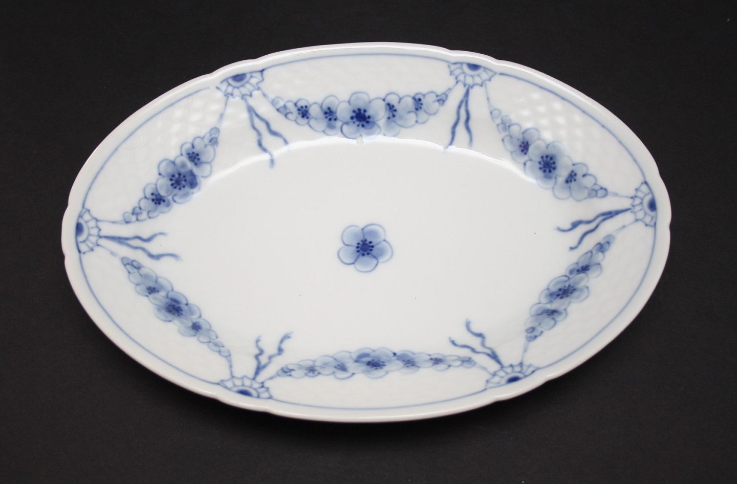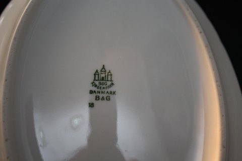 Bing & Grøndahl, Empire, hvidt porcelæn med blå ranker. Mellemstort fad. Formnr. 18. II. sortering. Længde 25 cm. Bredde 17,5 cm. Pris: 225 kr.