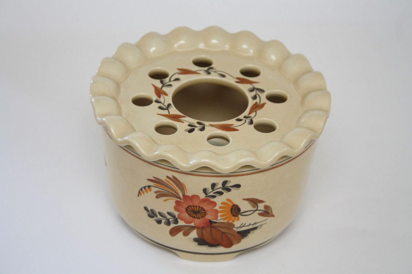 Aluminia fajance. Knud. Design Niels Thorsson. Håndmalet. Produceret i perioden 1934-1963. Fyrfad med låg og beholder til fyrfad. Perfekt stand. Højde 10 cm. Diameter 16 cm. solgt
