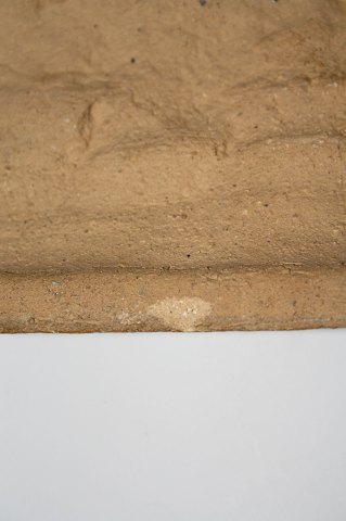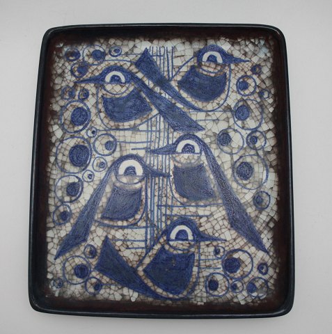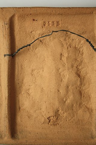 Søholm, Bornholm, relief med 2 fugle og 2 blomster i blå/brun glasur. Dek. nr. 5515. Signeret GHP, Gerd Hjort Petersen. Dybde 3 cm., længde 39,5 cm. Bredde 22 cm. Der er et afslag bagpå, som ikke ses når den er hængt op, se ekstra foto Pris: SOLGT