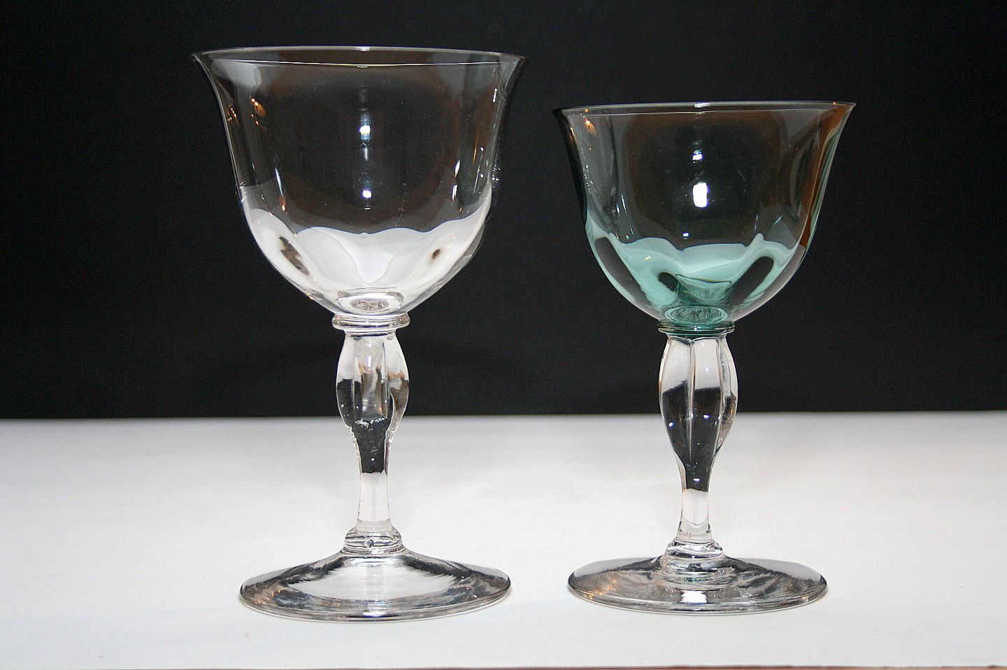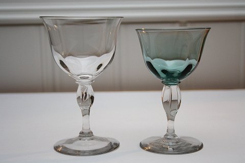 Viol, designer Jacob Bang, Holmegaard glasværk fra ca. 1928 Rødvin, højde 14,5 cm. Pris: SOLGT Hvidvin(petroleumsgrøn), Højde 13 cm. solgt