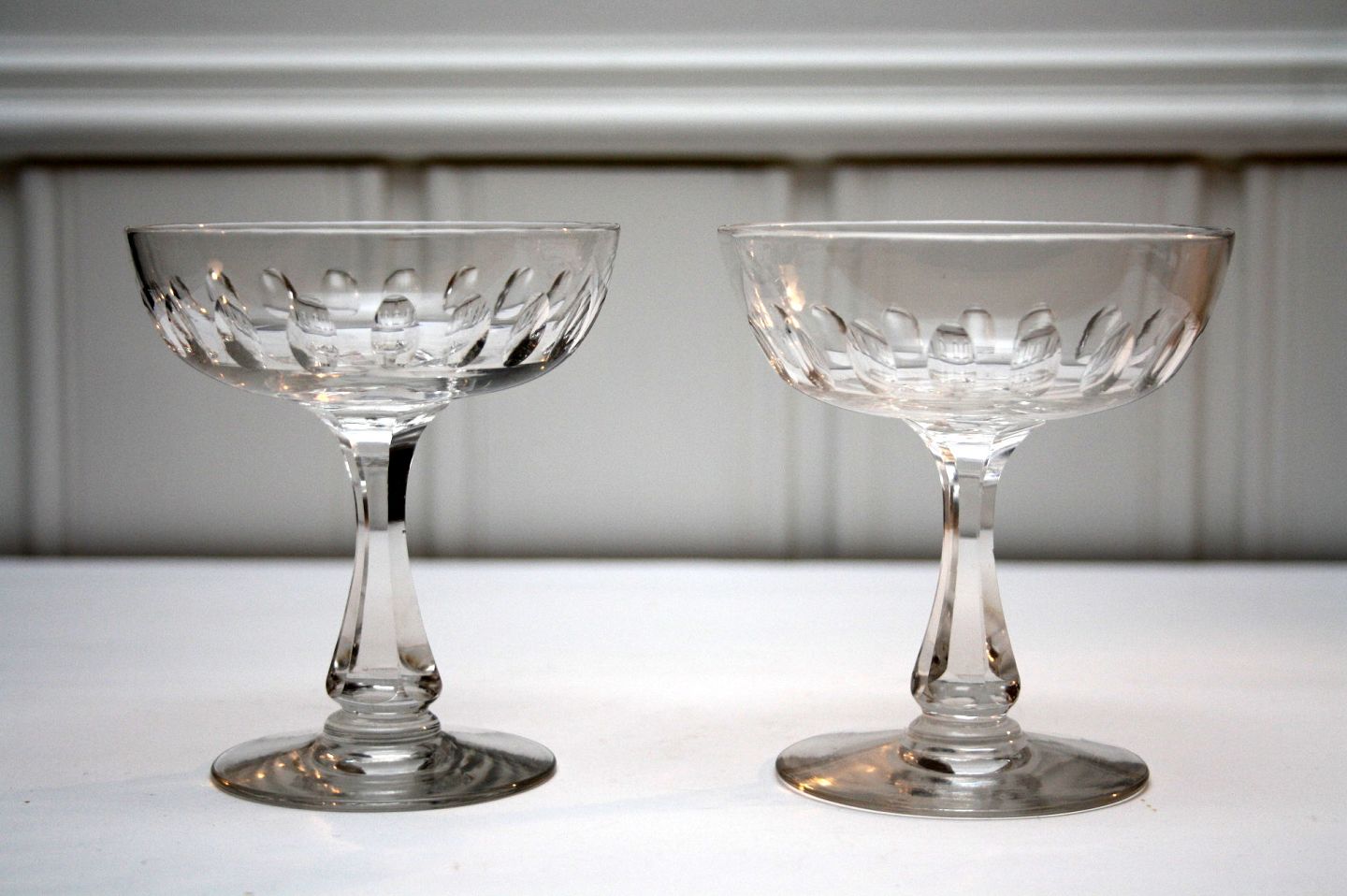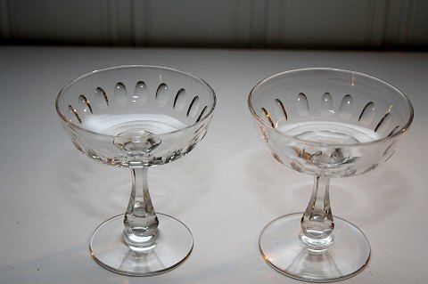 Derby, gamle Champageskåle rundslebne i foden. Højde 10,8 cm. Diameter 9,5 cm. På det ene er der et mikroskopisk afslag under foden. Pris: 500 kr. for parret