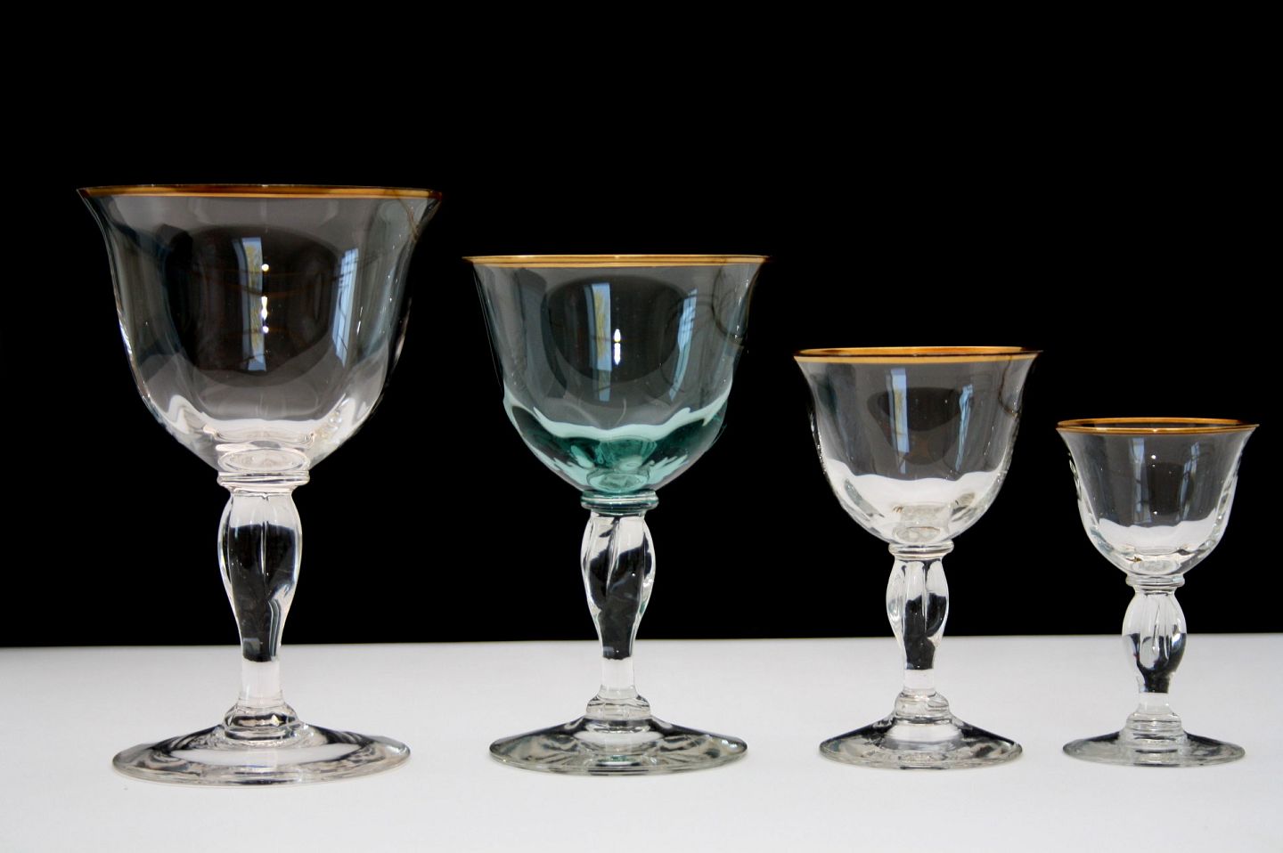 Viol med guld, designet af Jacob Bang 1928, Holmegaard glasværk. Rødvin, højde 14,5 cm. Pris: SOLGT Hvidvin (petroleumsgrøn), højde 13 cm. Pris: SOLGT Portvin, højde 10,2 cm. Pris: SOLGT Snaps, højde 8,5 cm. Pris: SOLGT