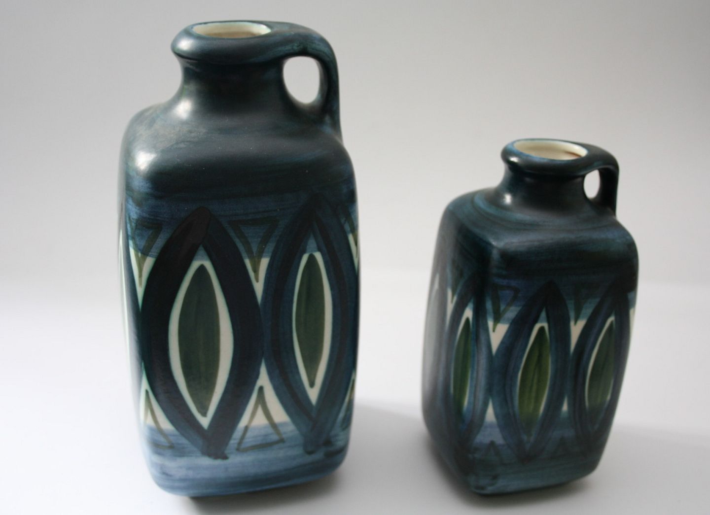 Knabstrup keramik, Dekoreret af Waltraud Praschak og formgivet af Günther Praschak 1966-70. Stor kande. Perfekt stand. Højde 20,5 cm. Bredde 10 cm. Pris: SOLGT Mellem kande. Perfekt stand. Højde 16 cm. Bredde 7,5 cm. Pris: SOLGT