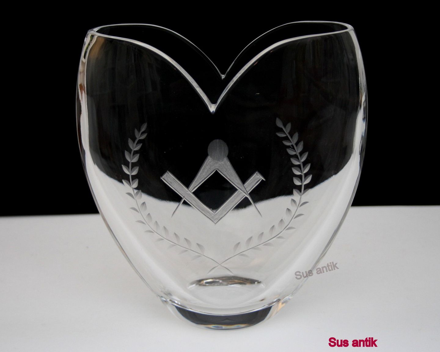 Frimurervase i tykt glas. Højde 18,5 cm. Længde 17,5 cm. Bredde 7,5 cm. Pris: