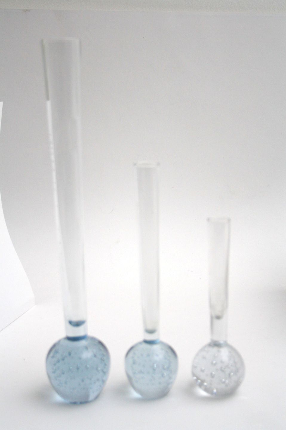 Holmegaard, Orkidévaser. Tv. Blålig tone. Højde 30 cm. Pris: SOLGT Midt. Blålig tone. Højde 20 cm. Pris: SOLGT Th. Klar. Højde 15,5 cm. Lettere kalk/snavs indvendig. Pris: SOLGT