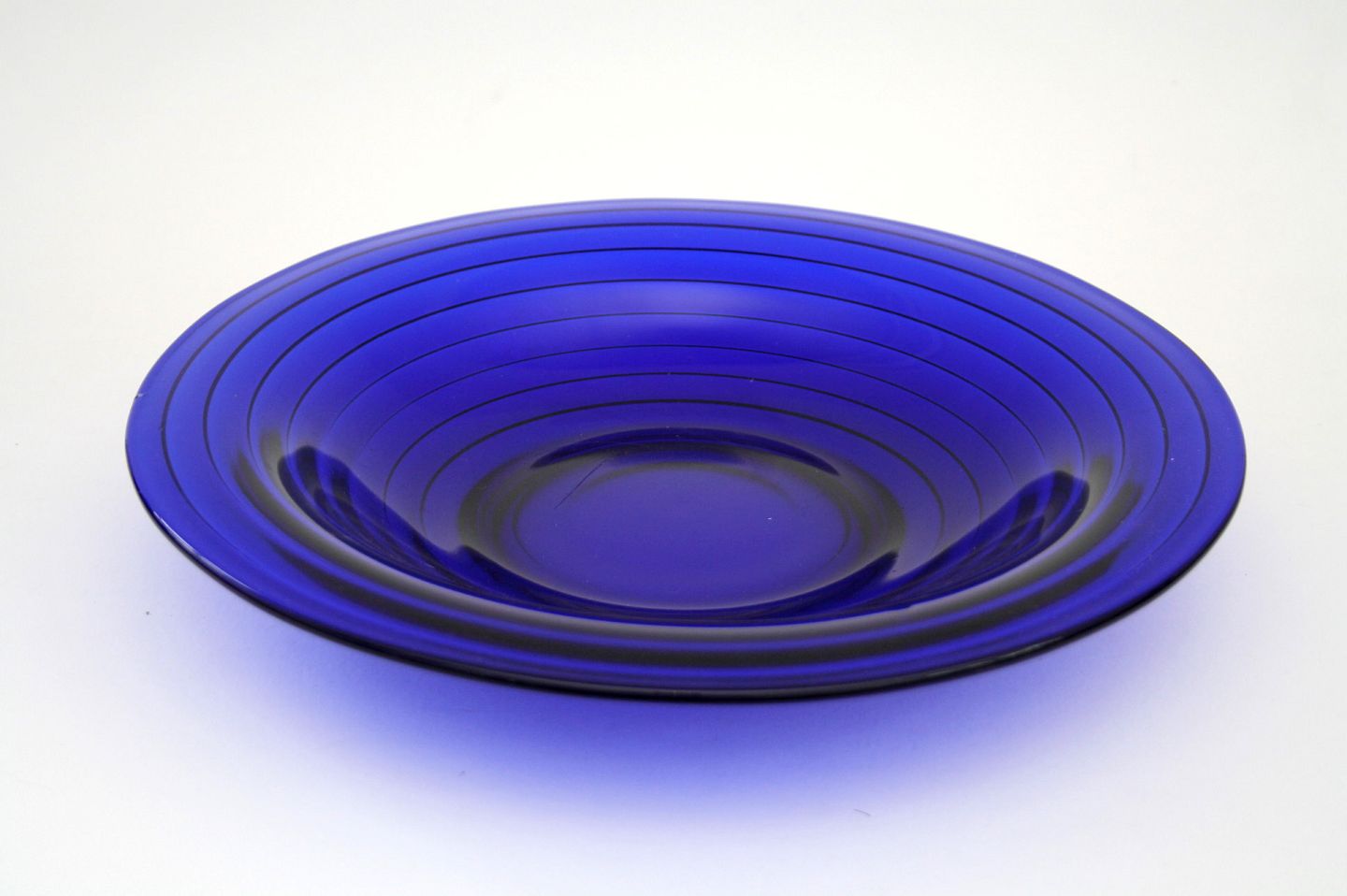 Holmegaard, Broksø presset glas 1938-1941, designet af Jacob E Bang. Mørkeblå rundt fad. Diameter 28 cm. Højde 4,5 cm. Pris:
