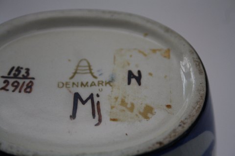 Aluminia. Lyseblå flaske med mørkeblå prop. Dek.nr. 153/2918. MJ. Lettere krakeleret og lille hak se foto. Højde ca 13 cm. Pris: SOLGT