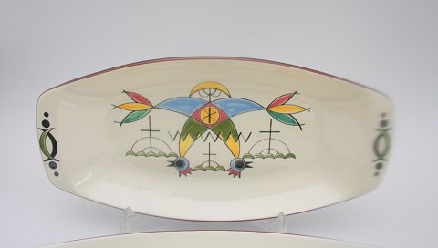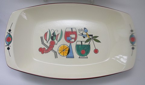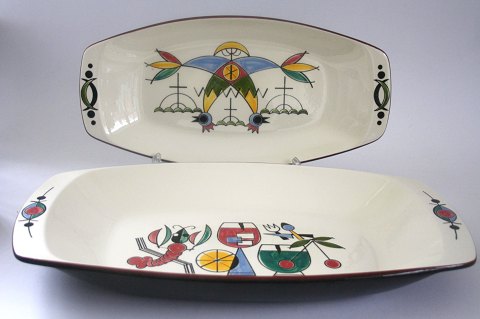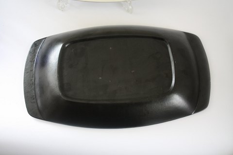 Knabstrup, Symfoni designet af Piotr Baro, formgivet af Johannes Hansen. I produktion i perioden 1959-61. Liggende fad forrest 39x23x4,5 cm. afslag bagpå se ekstra foto. SOLGT Stående fad bagerst.33x16x3,5 cm. SOLGT