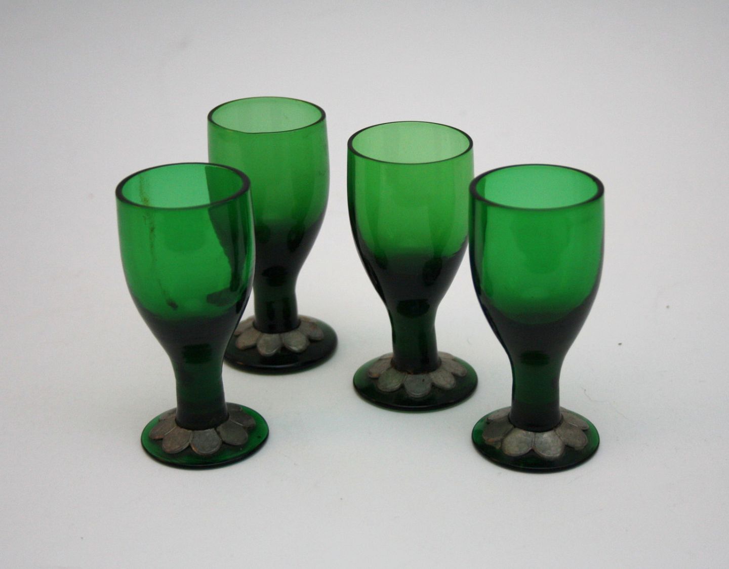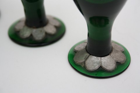 Små grønne glas med tinbelægning. Højde 5,5 cm. SOLGT