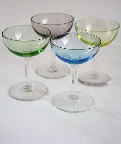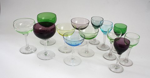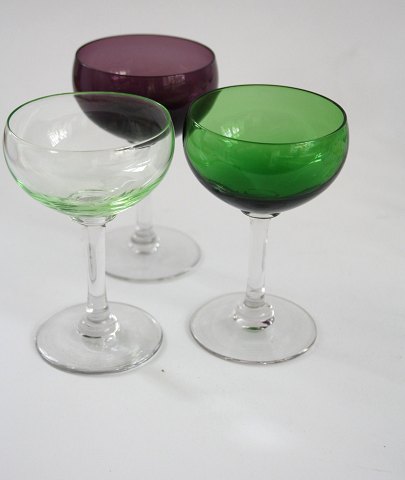 Holmegaard/Fyens glasværk, 3 forskellige slags farvede likør og snapseglas.