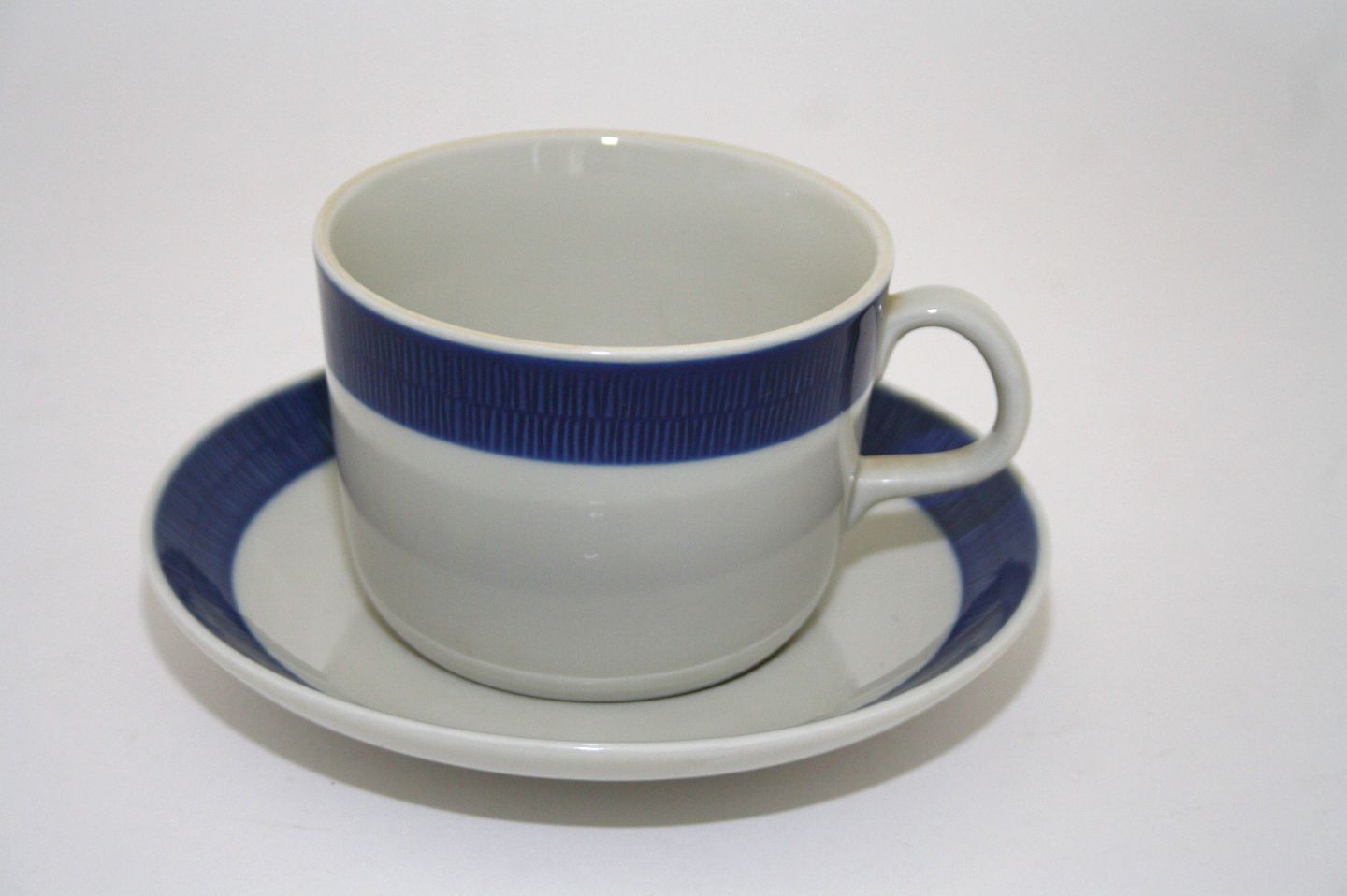 Rørstrand, Blå Koka designet af Hertha Bengtson i 1956. Tekop med underkop. Højde 7 cm. Diameter 9 cm. Pris: SOLGT
