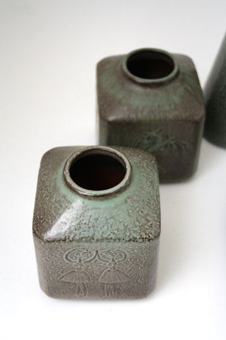 Tv. Firkantet vase. 10x10 cm. Højde 10 cm. Med afslag i kanten. Pris: 200 kr. stk. Lager: 2