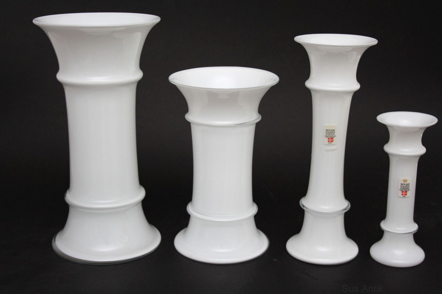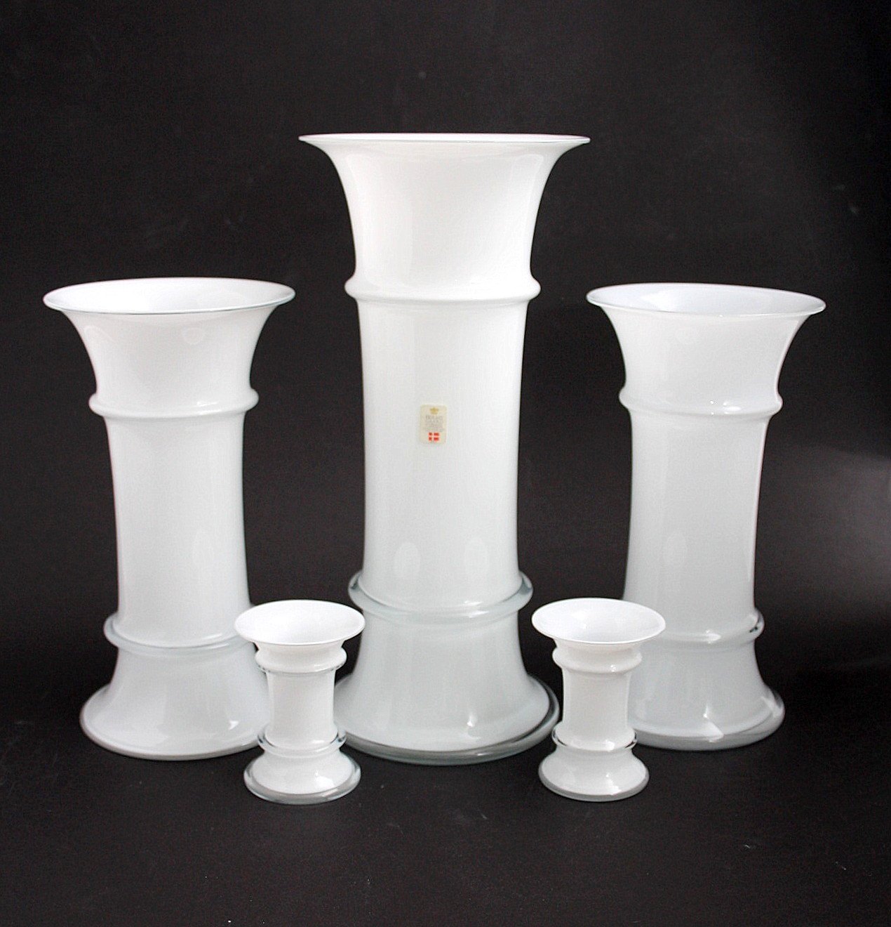 Holmegaard, MB serien designet af Michel Bang i 1981. Vaserne er formblæst i opal hvid glas med klare krystal overfang. Der er ingen signatur i denne serie.