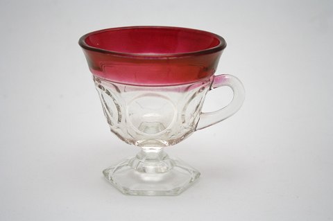 Amerikanske presset glas med rød lustrekant. Cocktailglas. Højde 7,5 cm. Diameter 9 cm. Pris: SOLGT Cocktailglas. Højde 8 cm. Diameter 9,5 cm. Pris: SOLGT Punchkop. Højde 9 cm. Diameter 8,5 cm. Pris: 100 kr. stk. Lager: 2