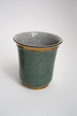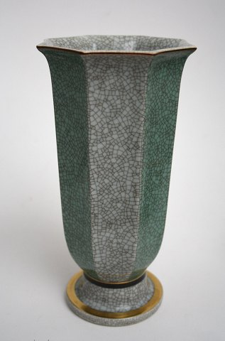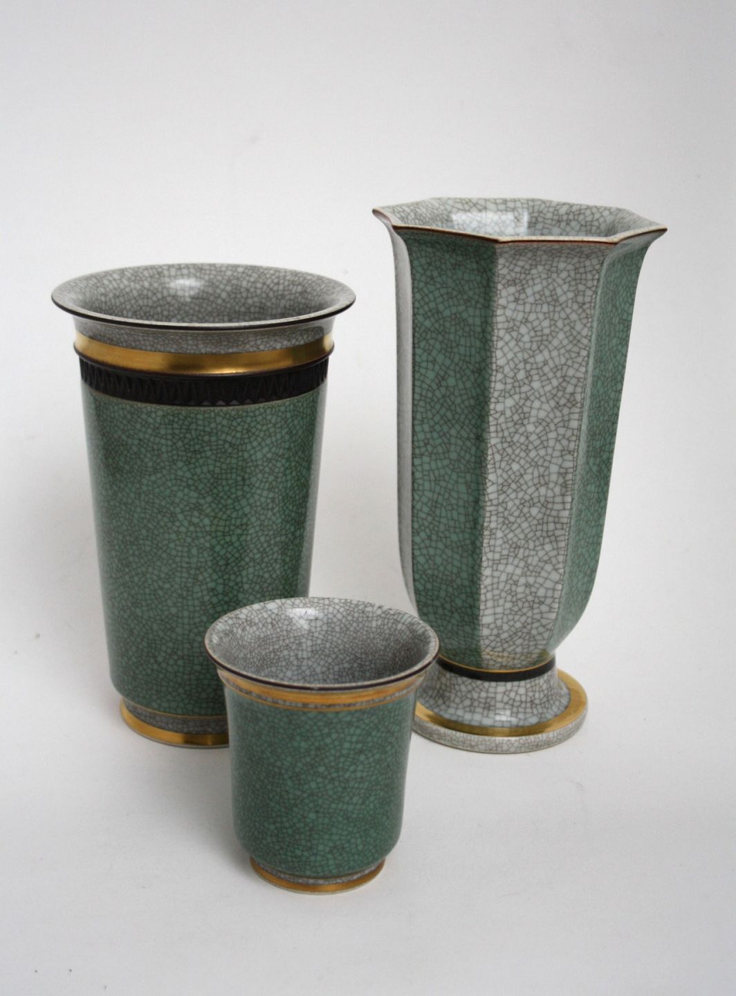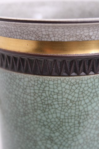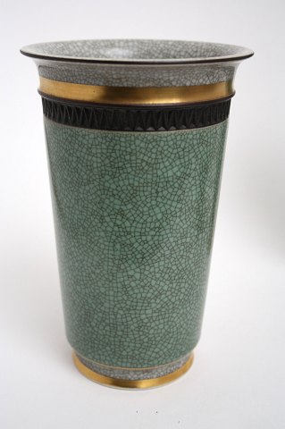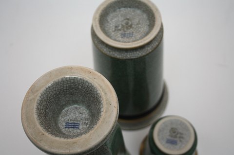 Royal Copenhagen, vaser i grønt og grå krakelé med sorte bånd og guldkant.
